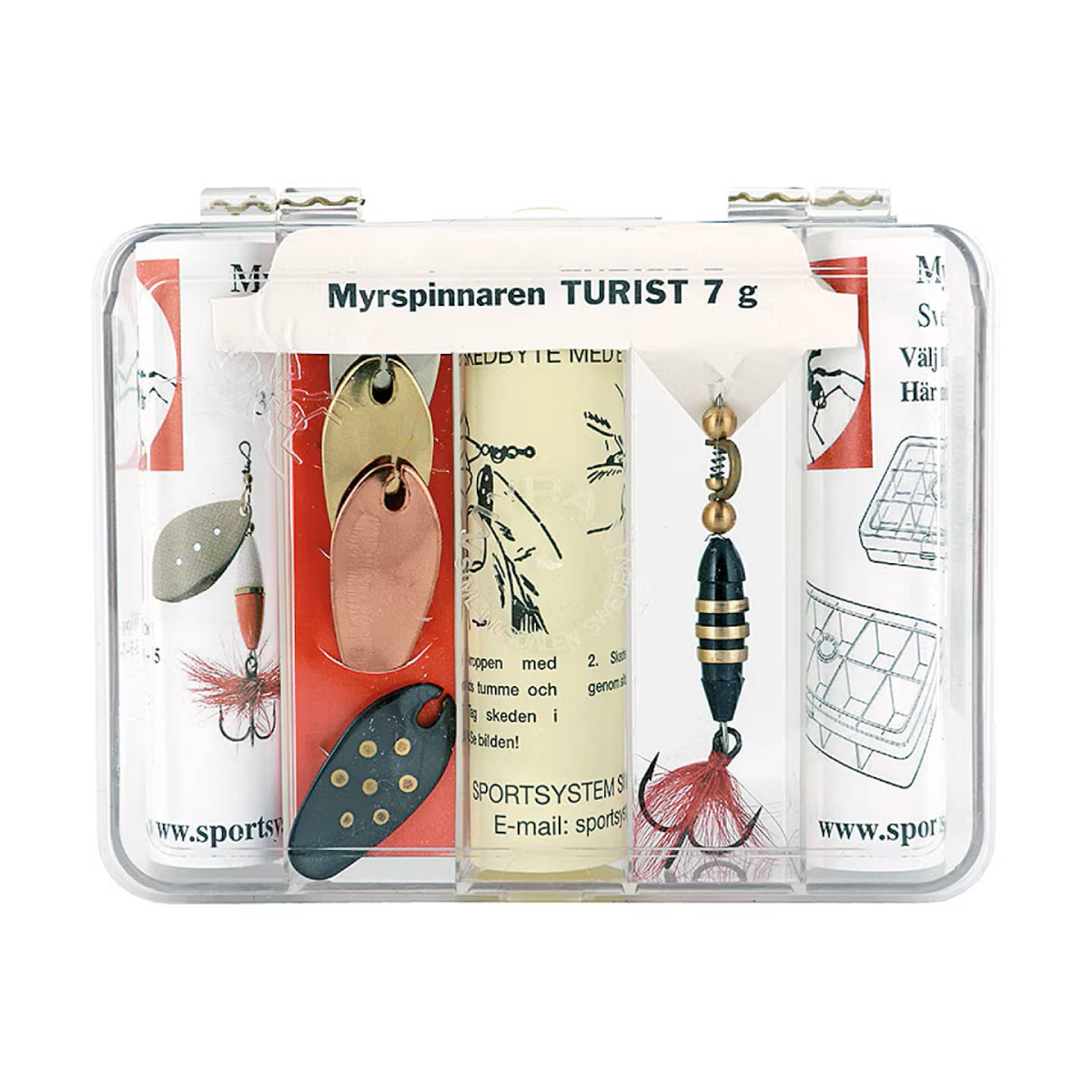 - Tusentals sportfiskares absoluta favoritbete - Med sin geniala konstruktion är det lätt och bekvämt att byta sked till den färg man önskar - Myrspinnaren har Myrans röda dunkrok - Turistförpackning är den smarta lösningen för dig som vill ha variation utan att bära tungt. Perfekt för vandring, camping eller fisketuren på semestern.